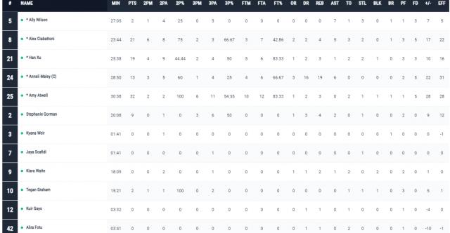 韩旭在上半场的表现是山猫拉开分差的关键。她首发出战14分57秒,投篮6中4效率稳定,其中三分球1投1中,罚球2罚全中,轻松拿到11分,同时还有1助攻2抢断1盖帽的全能数据,个人在场正负值高达+21,完美展现了“攻防一体”的核心价值。