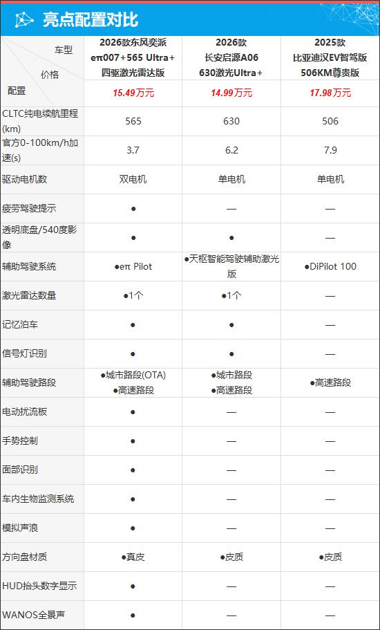 配置层面,我们挑选了售价相近的车型进行对比。结果显示,东风奕派eπ007+的性能参数和科技配置十分突出。比如,其官方0 - 100km/h加速时间仅3.7秒,还独享手势控制、面部识别等配置,这些都是年轻消费者喜爱的功能。2026款长安启源A06作为新上市车型,CLTC纯电续航里程是三款车中最长的,且和东风奕派eπ007+一样配备激光雷达、具备高速辅助驾驶功能,不用OTA就能使用城市辅助驾驶功能。相比之下,比亚迪汉EV智驾版的配置丰富度还有提升空间,这与其车型上市时间较长有一定关系。