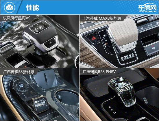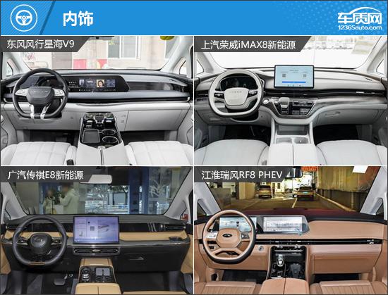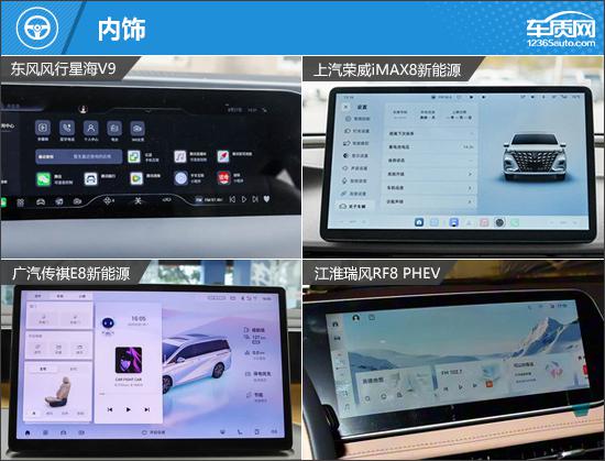 内饰均主打简洁科技风:东风风行星海V9与江淮瑞风RF8 PHEV采用双联屏设计,荣威iMAX8新能源和传祺E8新能源为悬浮中控屏+液晶仪表组合,传祺E8新能源的小尺寸仪表还能减少视线遮挡。换挡均为电子挡把,传祺E8新能源的设计更小巧精致。