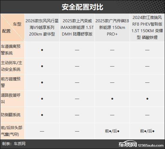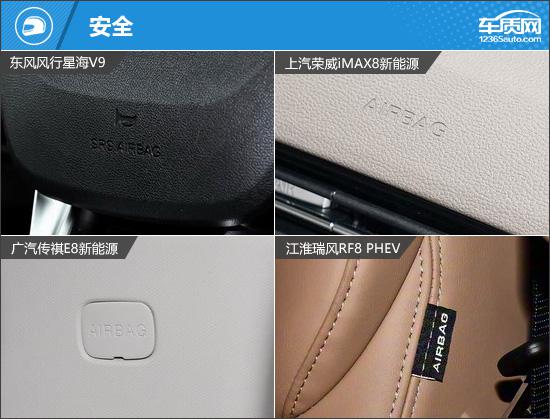 安全配置中,东风风行星海V9主动安全表现突出,独享车道偏离预警、主动刹车、前方碰撞预警、防侧翻系统;被动安全上,传祺E8新能源与江淮瑞风RF8 PHEV配备前后排头部气帘,保护更全面。荣威iMAX8新能源安全配置仍有缺失。