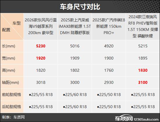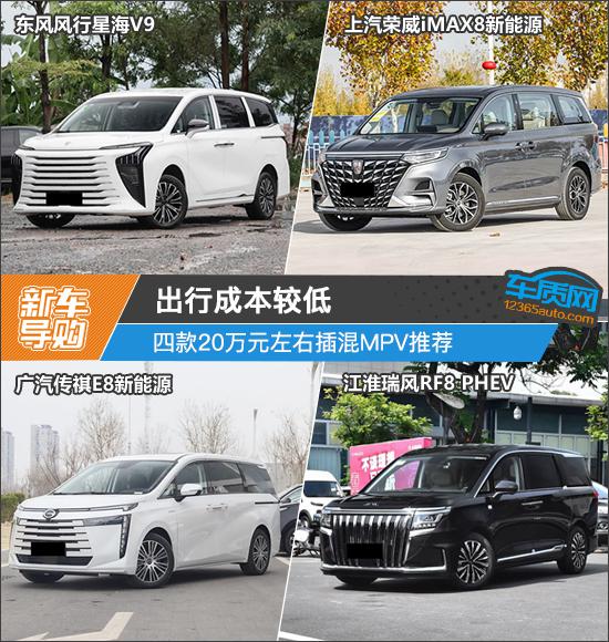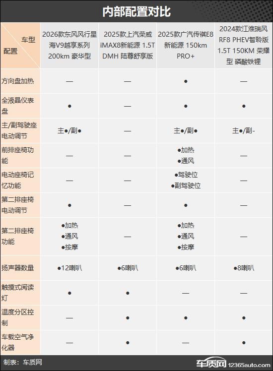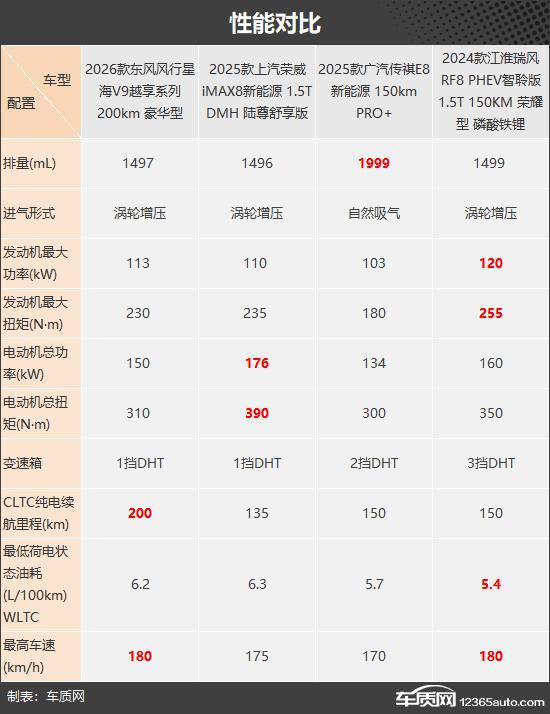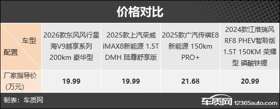 本次推荐的四款车型分别是2026款东风风行星海V9越享系列200km豪华型、2025款上汽荣威iMAX8新能源1.5T DMH陆尊舒享版、2025款广汽传祺E8新能源150km PRO+和2024款江淮瑞风RF8 PHEV智聆版1.5T 150KM荣耀型磷酸铁锂。它们定位相近、终端售价接近,能满足不同用户的需求(注:部分车型图片非对应具体款型)。