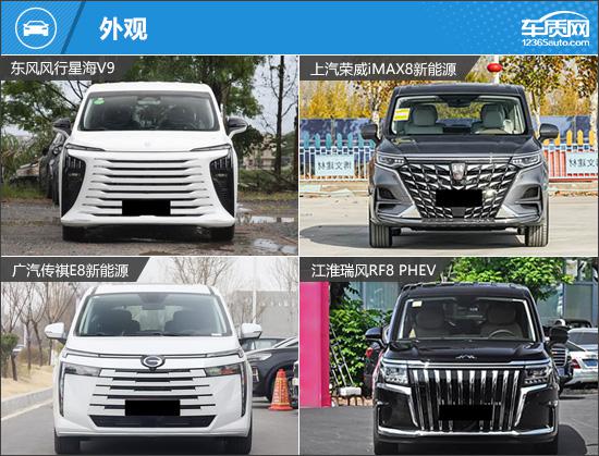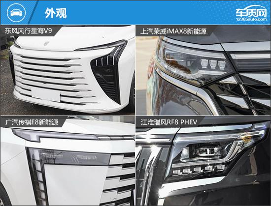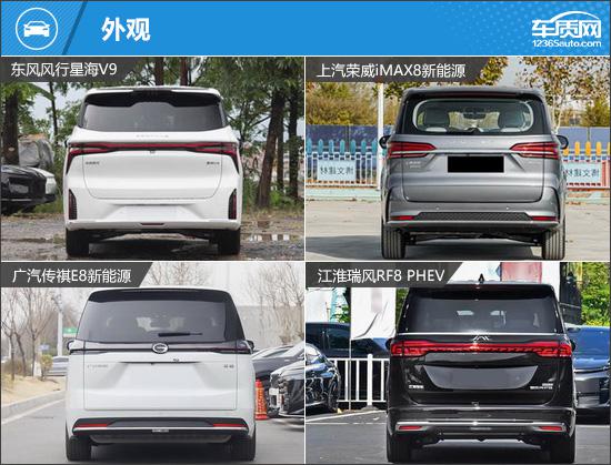车尾设计均用直线增强开阔感:江淮瑞风RF8 PHEV和东风风行星海V9配贯穿式尾灯,传祺E8新能源为贯穿风格设计,荣威iMAX8新能源虽为传统尾灯,但通过装饰条连接两侧,增强整体感。