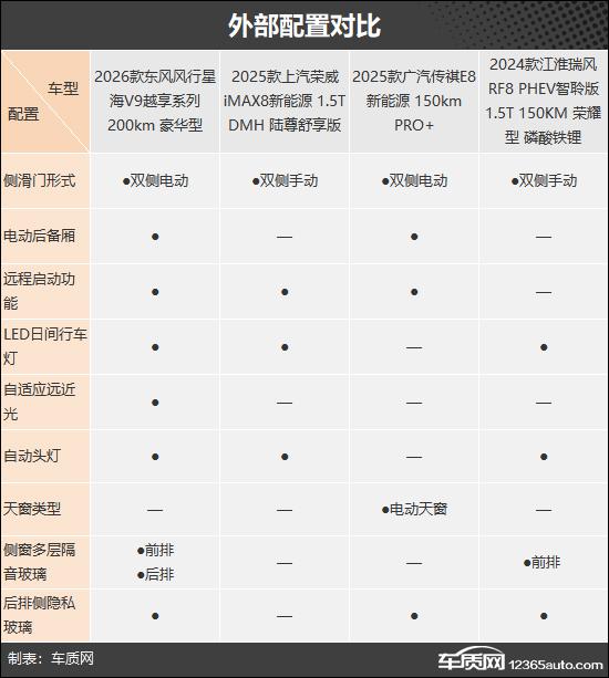 外部配置上,东风风行星海V9表现最佳,独享自适应远近光、后排多层隔音玻璃,还配备双侧电动侧滑门、电动后备厢;荣威iMAX8新能源配置稍逊,部分功能缺失影响体验。