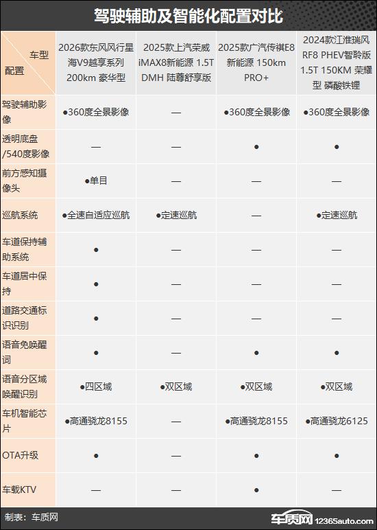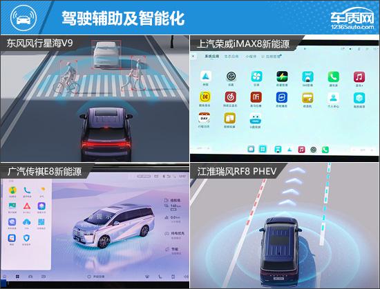 驾驶辅助方面,东风风行星海V9领先,配备全速自适应巡航、车道保持、交通标识识别、360度全景影像;智能化配置则是传祺E8新能源更全面,搭载高通8155芯片,支持OTA升级、语音免唤醒,还独享车载KTV功能。荣威iMAX8新能源在这两项配置上依旧表现不佳。
