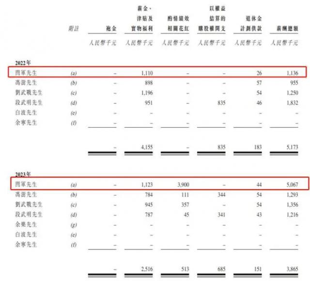 薪酬方面,2023年闫军薪酬(剔除权益结算的购股权开支)为506.7万元,2024年为500.7万元,两年合计领取薪酬1006.7万元。