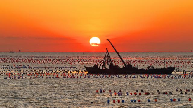 12月5日清晨,山东日照东港区涛雒沿海,出海渔船迎着朝阳穿梭于海洋牧场,与金色朝阳、彩色浮漂相互映衬,构成了美丽的海上生态图景。