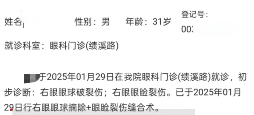 医院出具的诊断证明书显示:初步诊断为右眼眼球破裂伤。已于2025年1月29日进行右眼眼球摘除+眼睑裂伤缝合术。