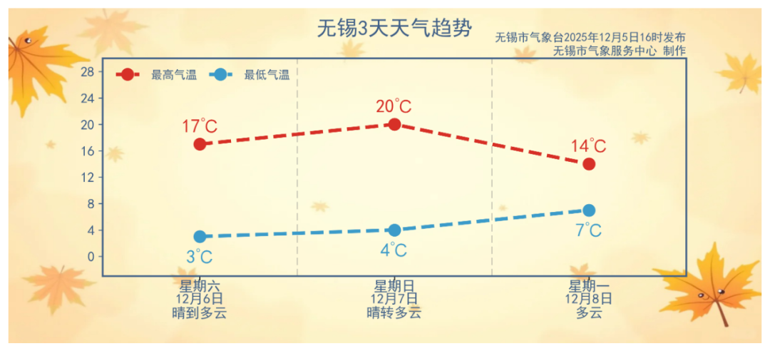 据无锡气象信息,今明两天我市以多云为主,气温逐步上升,7日最高温将达20℃左右。预计7日夜里有弱冷空气影响,8—9日气温略降,10—11日气温再次回升,12日或有小雨。