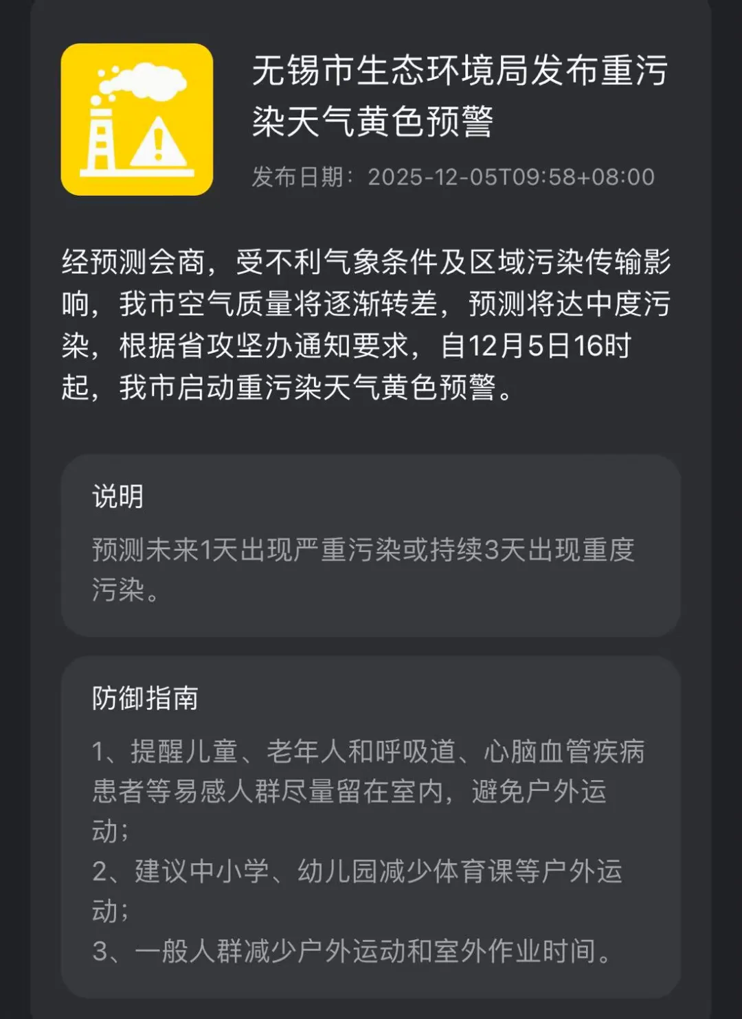 关窗戴口罩!无锡发布重污染天气黄色预警