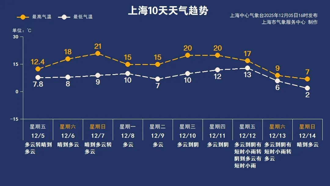 天气趋势:下周初冷空气影响,申城最高温降至15℃左右,偏北风增大至4~5级阵风6级,体感转凉;周三周四最高温回升至20℃;下周五前后第二轮冷空气来袭,伴有大风、降温和弱降水。气温起伏大,需及时增减衣物防感冒。
