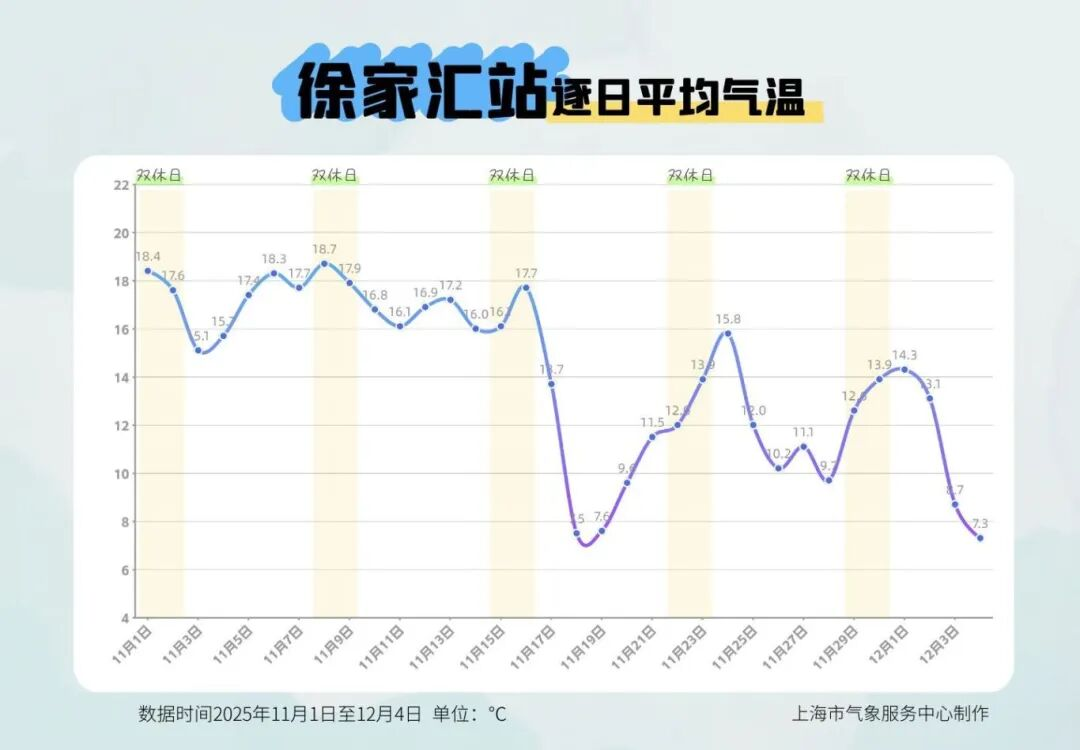 11月以来,每逢双休日徐家汇站的日平均气温较工作日相对偏高,11月中旬后气温波动加大,双休日的暖意更明显。本周双休日延续这一特点,气温再度回升。