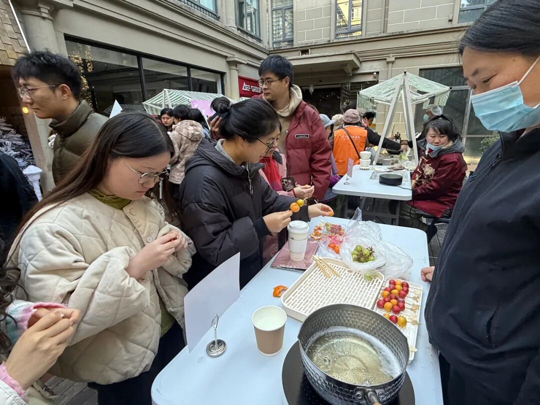 本次活动的一大亮点——“愚园嘉春·丰味市集”在嘉春园区热闹开集。市集通过一系列创意满满的“风味碰撞”,唤醒参与者的味蕾记忆,推动多元文化交融。现场,洛克菲勒公馆的经典菜肉馄饨与1853潮咖的精品手冲咖啡巧妙搭配,带来传统与现代的味觉邂逅;董记庐春面馆浓油赤酱的大肠面,与希华集团地道的希腊蜂蜜核桃酥展开跨地域的风味“对话”;SMAKA的酥香可颂则与中和·国风茶园的特色功夫茶相遇,演绎出中西合璧的闲适时光。此外,市集还设置了糖葫芦DIY与糖画制作摊位,让传统手作的甜蜜在大家的指尖流转,唤起童年的温馨回忆。