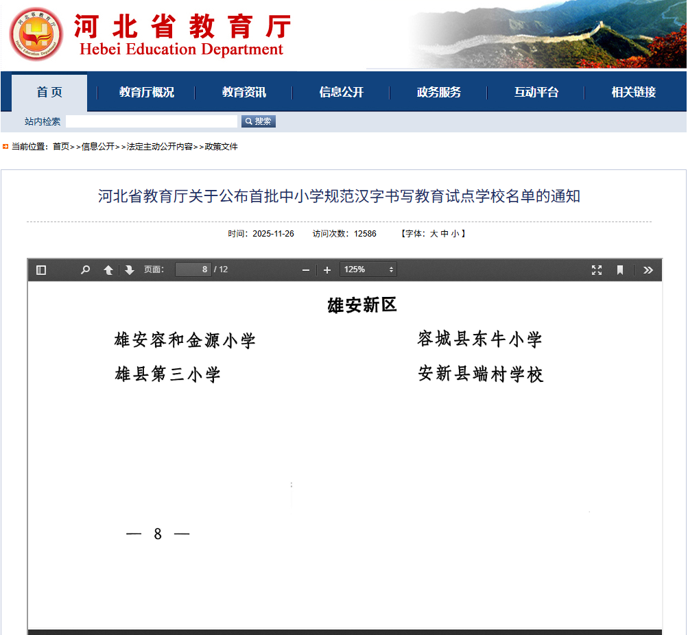 雄安4所学校入选!河北省首批中小学规范汉字书写教育试点学校名单公布