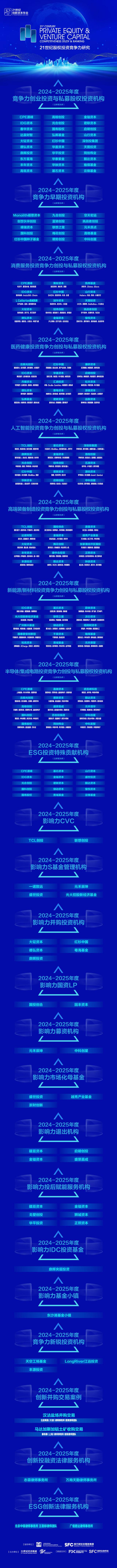 在此次活动现场,21世纪创投研究院隆重推出了《2024-2025年度21世纪股权投资竞争力研究案例》。该研究案例涵盖了多个领域的竞争力机构,具体有2024-2025年度竞争力创业投资与私募股权投资机构、2024-2025年度竞争力早期投资机构、2024-2025年度消费服务投资竞争力创投与私募股权投资机构、2024-2025年度医药健康投资竞争力创投与私募股权投资机构、2024-2025年度人工智能投资竞争力创投与私募股权投资机构、2024-2025年度高端装备制造投资竞争力创投与私募股权投资机构、2024-2025年度新能源/新材料投资竞争力创投与私募股权投资机构、2024-2025年度半导体/集成电路投资竞争力创投与私募股权投资机构以及ESG投资特殊贡献机构等。