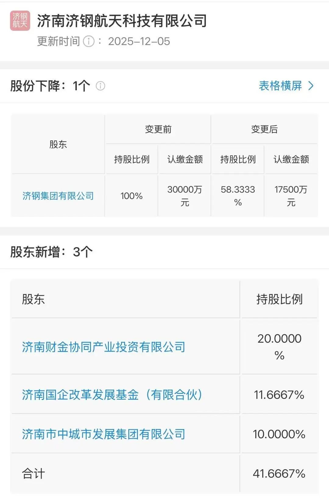 12月5日,济南济钢航天科技有限公司(以下简称“济钢航天科技”)完成工商变更登记,原全资控股股东济钢集团的持股比例调整为58.33%,新增济南财金协同产业投资有限公司、济南国企改革发展基金(有限合伙)、济南市中城市发展集团三家股东,分别持股20%、11.67%、10%,合计持股占比达41.67%。这一股权变动标志着济南国资在航天科技领域的布局实现关键突破,济钢航天科技的股权架构正式升级。