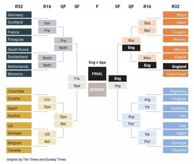 根据赛事规则,12个小组的前两名与8个成绩最佳的小组第三将晋级32强淘汰赛。《泰晤士报》基于分组情况给出了后续赛程的预测: