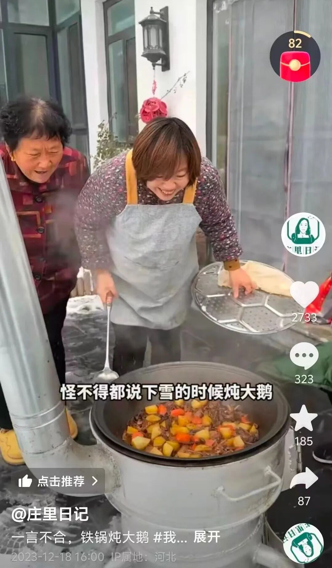王晶夫妇的创作始于朴素念头:“咱农村的饭喷香!想让更多人看看农村人咋吃饭、吃啥饭。”于是自家农家小院成了摄影棚,土灶铁锅成了道具。镜头里有清晨菜园刚摘的新鲜蔬菜,有婆婆传授的手工馒头技艺,有大锅炖骨头咕嘟作响的诱人声音。从《柴火灶炖大鹅,这才是农村聚餐的排场》到《纯手工杂面窝窝,老一辈手艺不能丢》,每条视频都满是“接地气”细节:妻子系着洗得发白的围裙在灶台翻炒,王晶在旁举着手机,时而调整角度,时而被油烟呛咳却仍认真记录。视频没有精致滤镜,却有最真实的乡村温度;没有华丽解说,却有最质朴的方言旁白:“家人们,看这菜炖得烂糊不?”“手工面条就得擀得厚薄均匀才筋道!”
