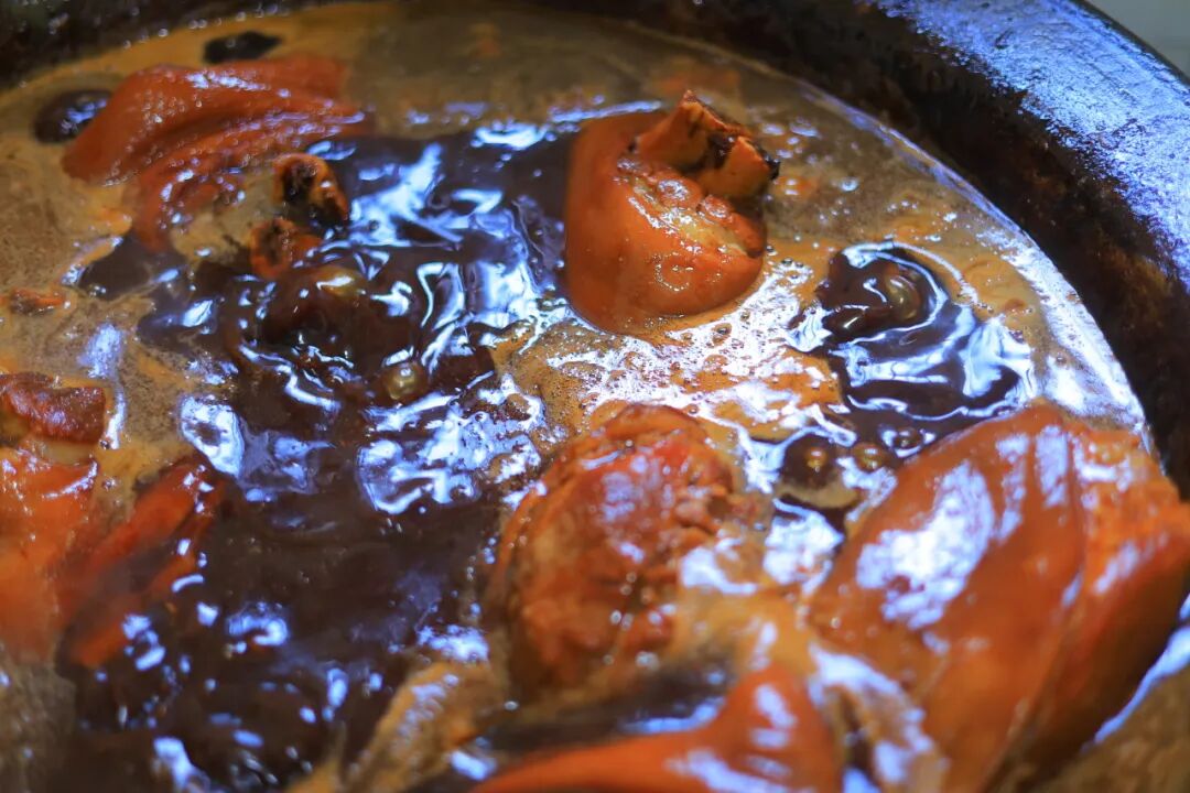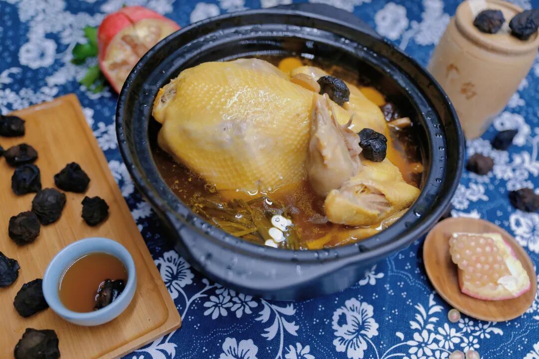 “青果熏制得乌梅,长兴乌梅独占魁”,湖州的乌梅制作技艺历史悠久,当地人也素来爱吃乌梅。乌梅鸡就是将鸡肉的鲜美与乌梅的清甜完美结合的一道菜。炖煮时,除了加入乌梅,还会放入党参、当归等少量中药材,经过两个多小时的柴火慢炖,汤汁浓郁淡雅,鸡肉软烂Q弹,这便是小火慢炖赋予美食的独特魅力。