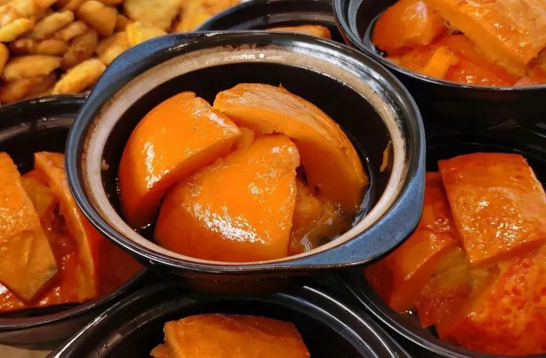 南瓜煲这道炖品,几乎能出现在湖州所有的宴席上,也是湖州人从小吃到大的“金色甜点”。选用当地南瓜秘制而成,色泽金黄,香糯味甜,用砂锅炖煮,最大程度保留了南瓜的本味。炖得酥烂的南瓜,嘴唇一抿就滑入食道,热腾腾的、甜蜜蜜的,吃下去肚子里舒服极了。