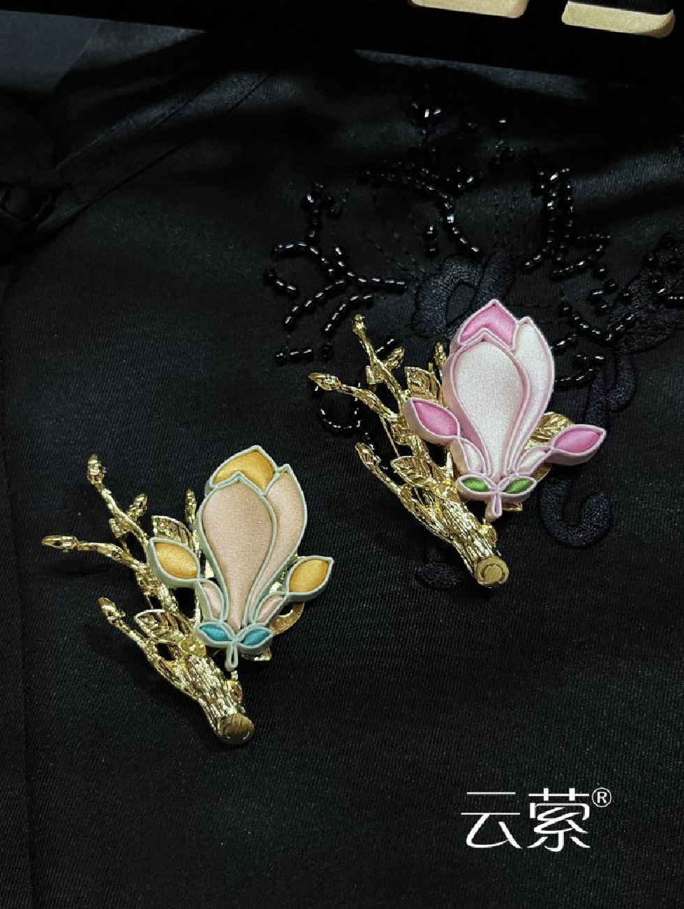 “爱上海”白玉兰盘扣胸针以上海市花白玉兰为原型,采用纯手工制作,并搭配现代金属配饰,传递出奋发向上的城市精神,该作品曾入围2024中国特色旅游商品大赛。