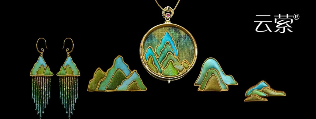 “千里江山”盘扣饰品礼盒系列取材于北宋名画,运用“俏色塞芯”等创新技法还原青绿山水的意境,搭配金银花丝、串珠等工艺及香道文化,荣获中国旅游商品大赛银奖等多项荣誉。