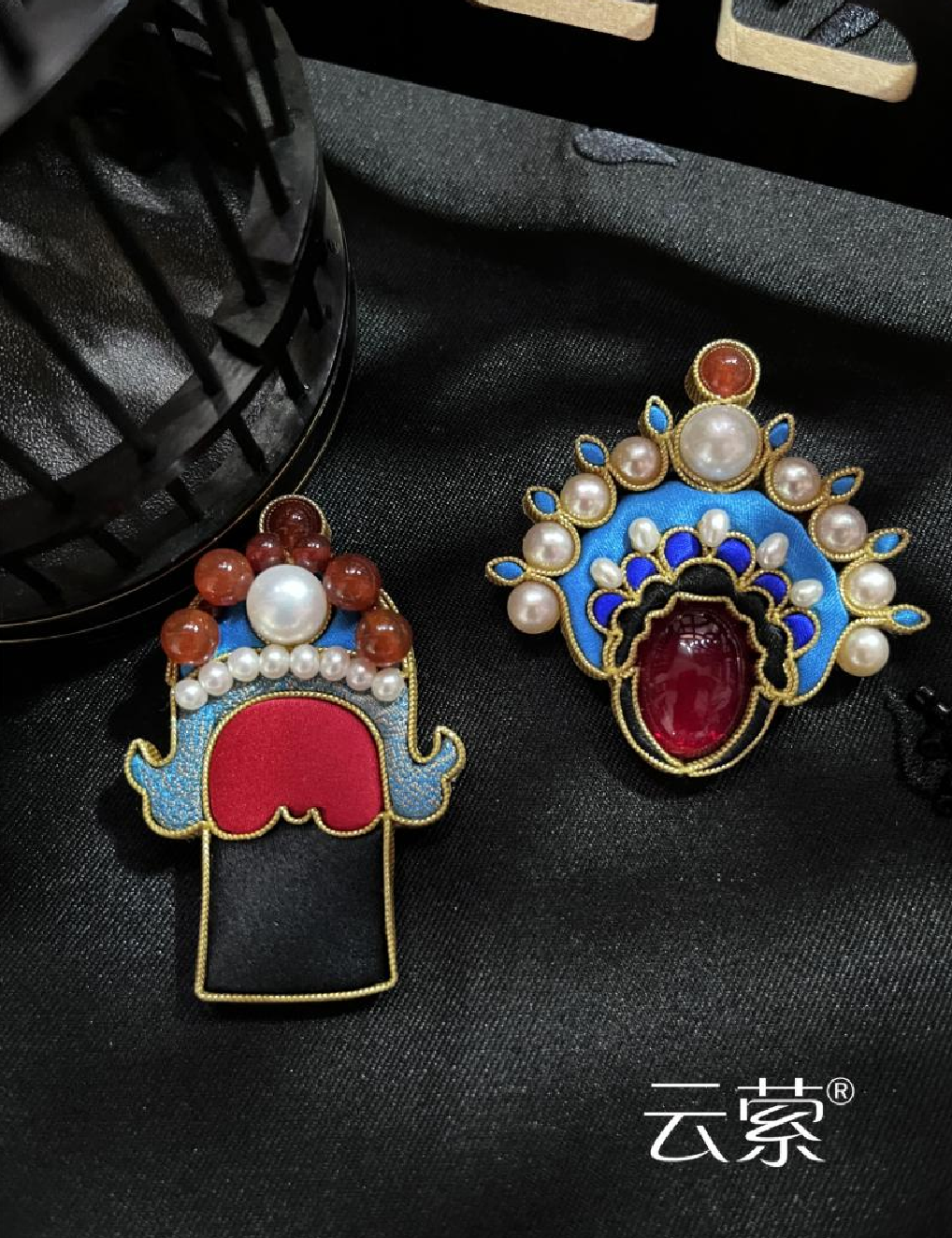 “国粹”盘扣胸针系列融合了京剧与盘扣两项非遗技艺,创新加入珠宝镶嵌工艺,斩获多项国潮文创大奖。