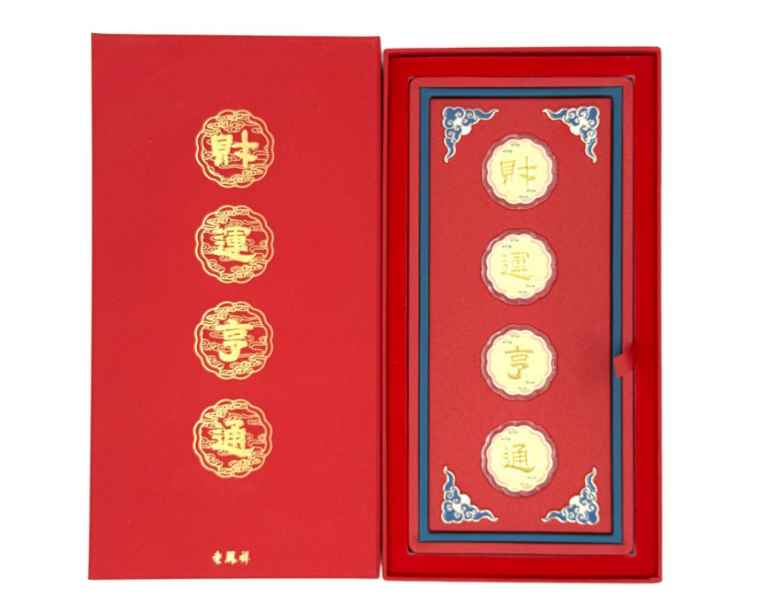 “财运亨通”礼品摆件以中国风为基调,圆润金黄的主体搭配如意云纹,足金材质与精湛的珐琅工艺相互映衬、相得益彰。