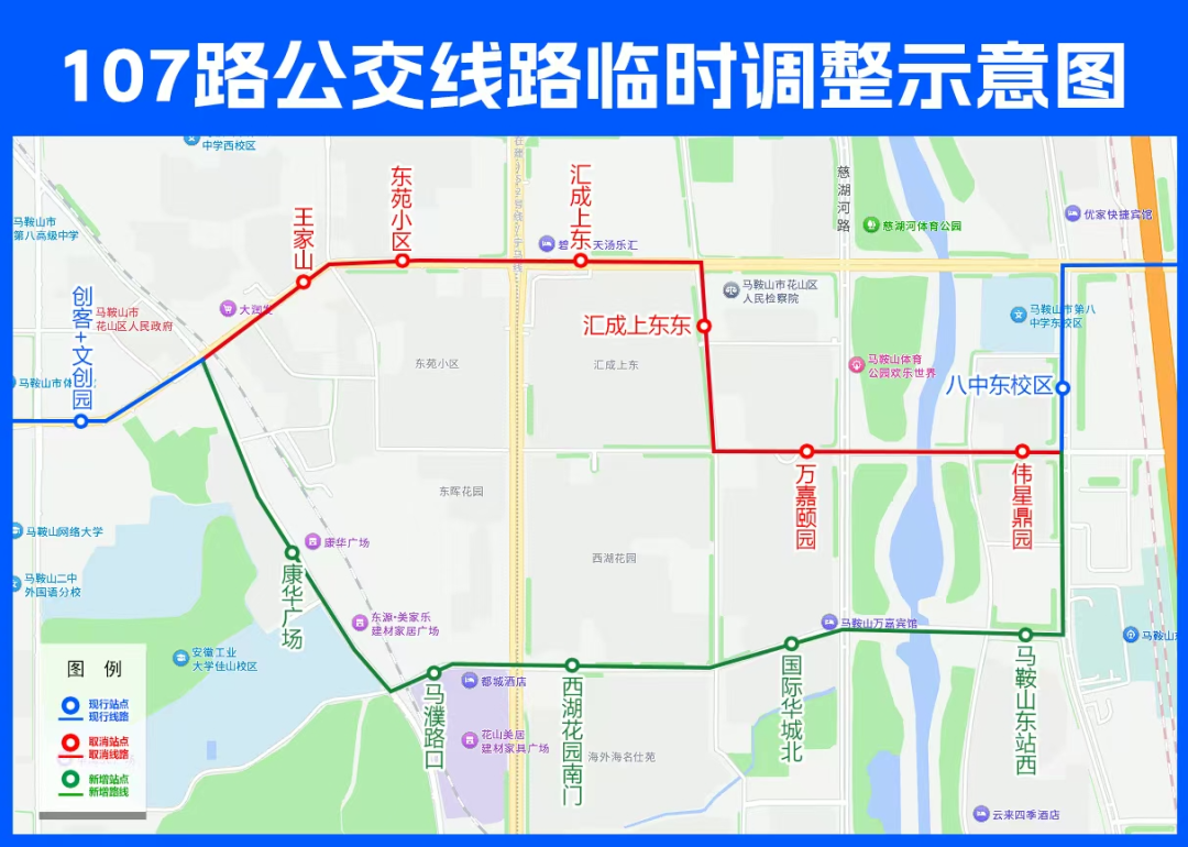 107路临时改走湖北路、花山路、马濮路、天宝路,停靠“康华广场、马濮路口、西湖花园南门、国际华城北、马鞍山东站西”站,原“王家山、东苑小区、汇成上东、汇成上东东、万嘉颐园、伟星鼎园”站暂不停靠。