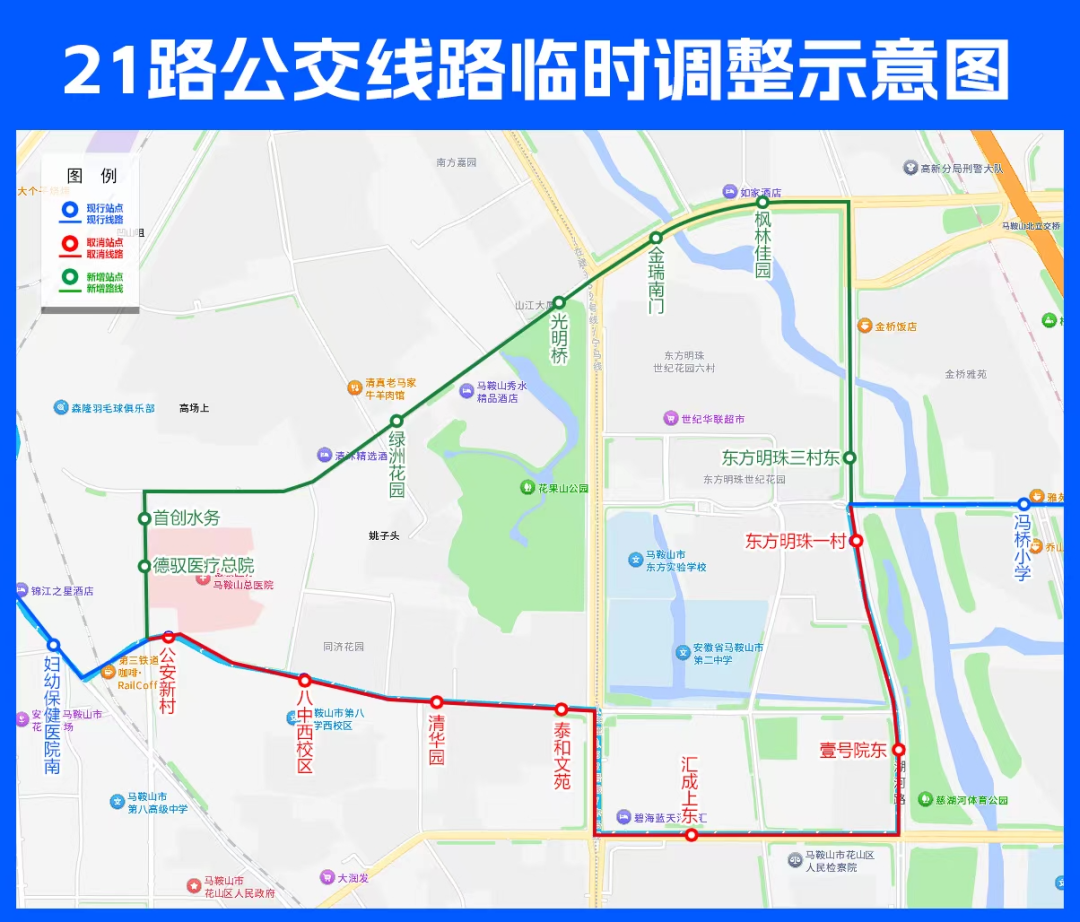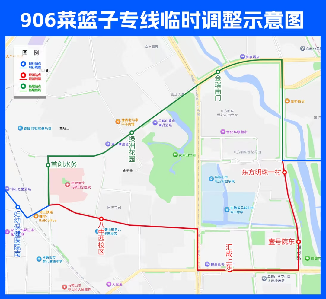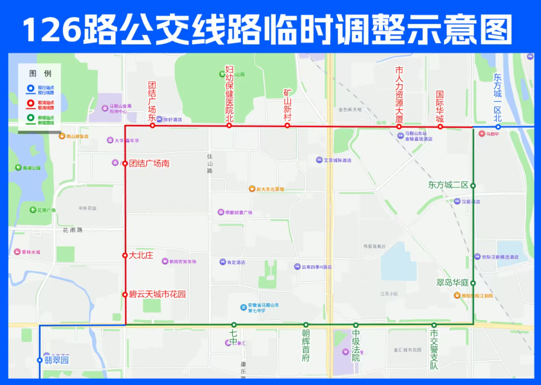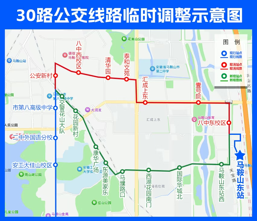 30路临时改走湖东路、花山路、马濮路、天宝路,停靠“交警花山大队、花园新村、康华广场、东源美家乐、马濮路口、西湖花园南门、国际华城北、马鞍山东站西”站,原“八中东校区、壹号院、汇成上东、泰和文苑、清华园、八中西校区、公安新村”站暂不停靠。
