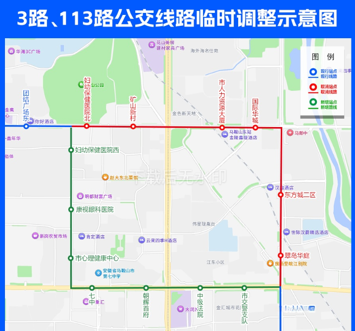 3路、113路将临时改走佳山路、雨山路,停靠“妇幼保健医院西、康视眼科医院、市心理健康中心、七中、朝辉首府、中级法院、市交警支队”站,原“妇幼保健医院北、矿山新村、市人力资源大厦、国际华城、东方城二区、翠岛华庭”站暂不停靠。