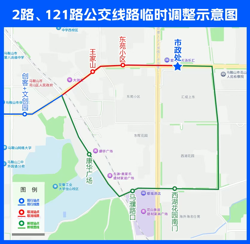 2路、121路临时改走花山路、马濮路、东晖路,停靠“康华广场、马濮路口、西湖花园南门”站,原“王家山、东苑小区”站暂不停靠。