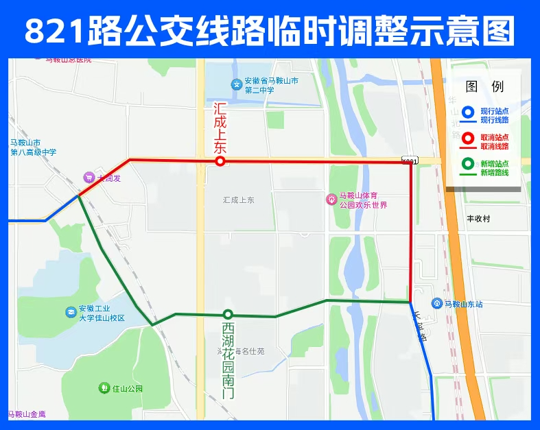 821路临时改走花山路、马濮路,停靠“西湖花园南门”站,原“汇成上东”站暂不停靠。