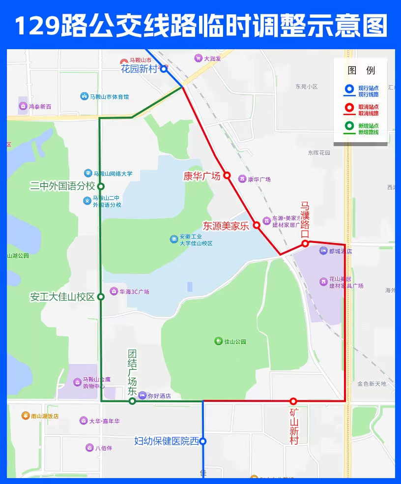 129路临时改走湖北路、湖东路、湖南路,停靠“二中外国语分校、安工大佳山校区、团结广场东”站,原“康华广场、东源美家乐、马濮路口、矿山新村”站暂不停靠。