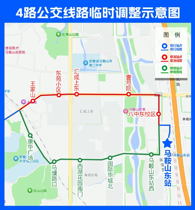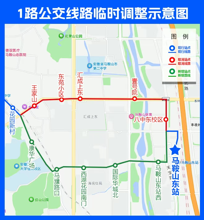 1路、4路临时改走花山路、马濮路、天宝路,停靠“康华广场、马濮路口、西湖花园南门、国际华城北、马鞍山东站西”站,原“王家山、东苑小区、汇成上东、壹号院、八中东校区”站暂不停靠。