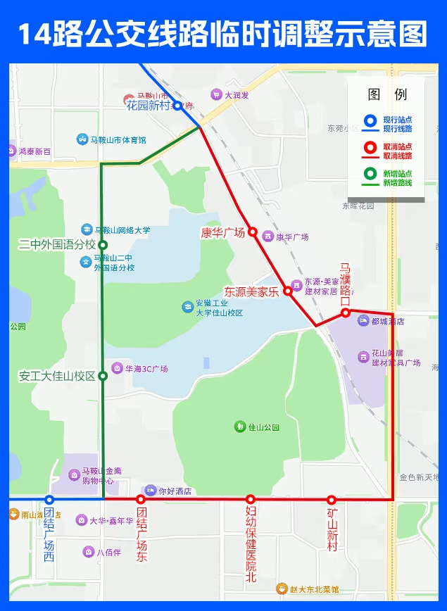 14路临时改走湖北路、湖东路、湖南路,停靠“二中外国语分校、安工大佳山校区”站,原“康华广场、东源美家乐、马濮路口、矿山新村、妇幼保健医院北、团结广场东”站暂不停靠。