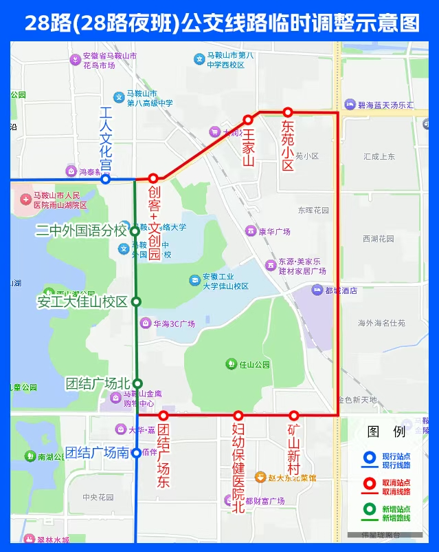 28路(含夜班)临时改走湖东路,停靠“二中外国语分校、安工大佳山校区、团结广场北”站,原“创客+文创园、王家山、东苑小区、矿山新村、妇幼保健医院北、团结广场东”站暂不停靠。