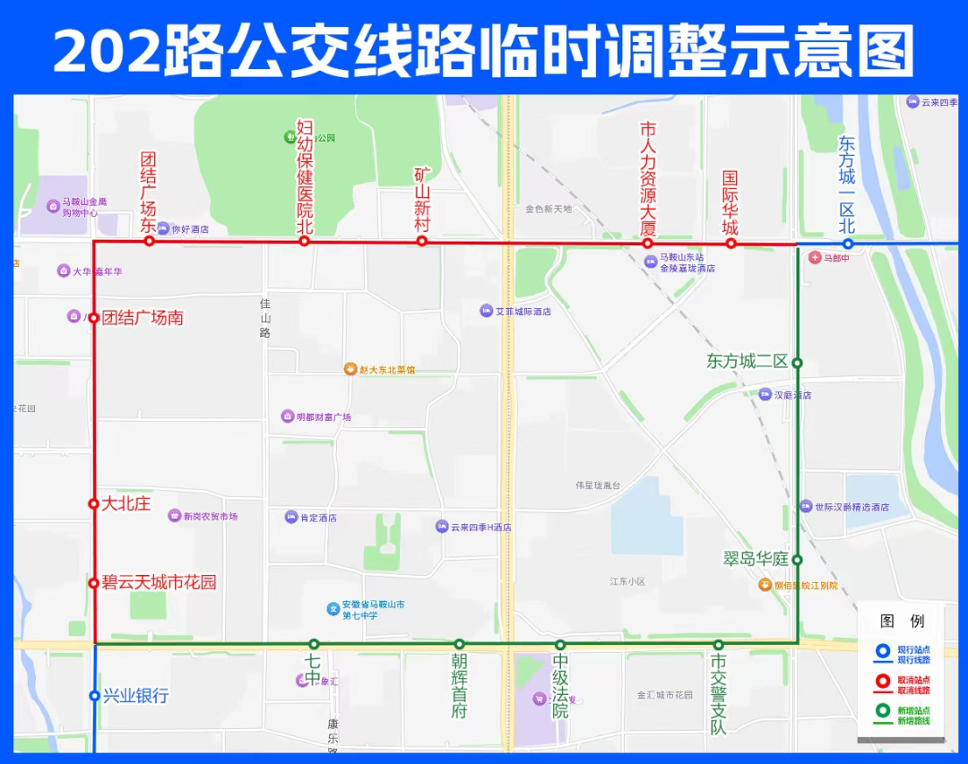 126路、202路临时改走雨山路、慈湖河路,停靠“七中、朝辉首府、中级法院、市交警支队、翠岛华庭、东方城二区”站,原“碧云天城市花园、大北庄、团结广场南、团结广场东、妇幼保健医院北、矿山新村、市人力资源大厦、国际华城”站暂不停靠。