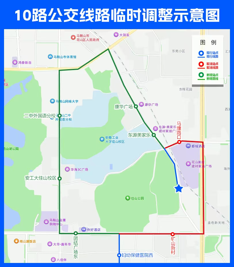 10路临时改走花山路、湖北路、湖东路、湖南路,停靠“东源美家乐、康华广场、二中外国语分校、安工大佳山校区、团结广场东”站,原“马濮路口、矿山新村”站暂不停靠。