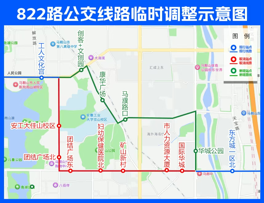822路临时改走湖北路、花山路、马濮路、慈湖河路,停靠“创客+文创园、康华广场、马濮路口、华城公园”站,原“安工大佳山校区、团结广场北、团结广场东、妇幼保健医院北、矿山新村、市人力资源大厦、国际华城”站暂不停靠。