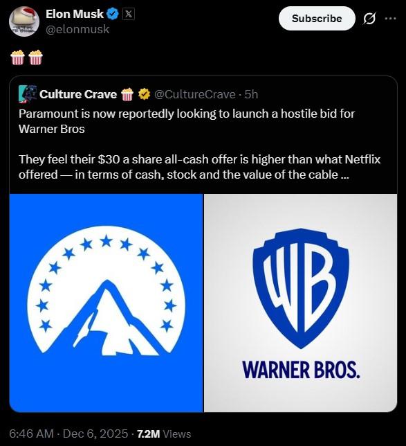 此外有消息称,派拉蒙正策划恶意收购,在阿拉伯资本支持下绕过管理层直接向股东出价,以每股30美元全现金收购华纳,出价高于网飞。
