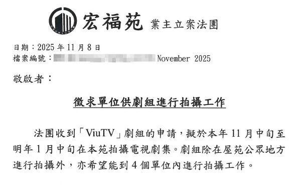根据网民提供的照片显示,宏福苑业主立案法团于2025年11月8日发出通告,内容提及ViuTV剧组向法团申请租用屋苑公众地方及4个单位用于拍摄,拍摄时间为2025年11月中旬至2026年1月中旬。