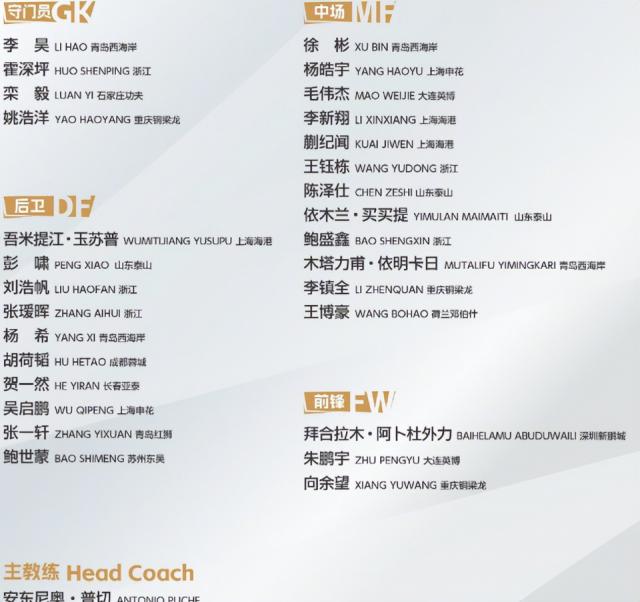 在新补招的3名球员中,门将姚浩洋是首次入选。山东泰山门将于金永因身体条件未达大赛标准暂时被弃用,而作为2028年洛杉矶奥运会适龄球员的姚浩洋,连续两年帮助云南玉昆、重庆铜梁龙冲超,中甲赛场出场经验丰富,得到安东尼奥征召也在情理之中。