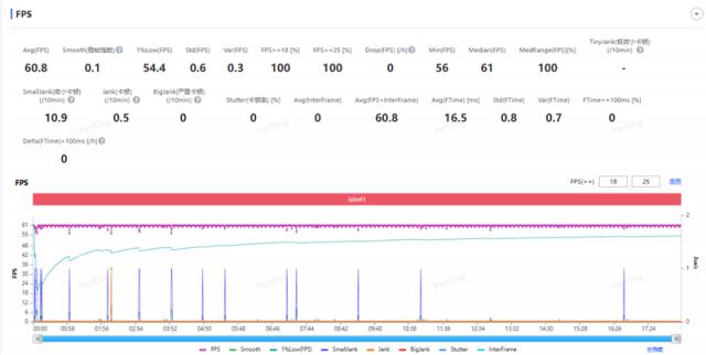 《原神》最高画质跑图测试中,平均帧率60.8帧,稳帧指数0.1,1%low帧54.4FPS,游戏体验流畅。