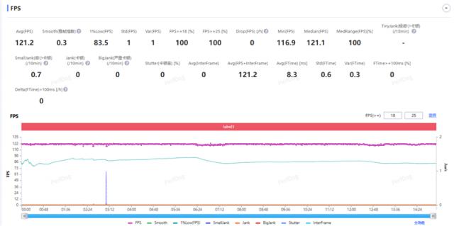 《王者荣耀》120帧极致画质模式下,回放测试平均帧率达121.2帧,稳帧指数0.3,1%LOW帧83.5FPS,游戏运行超稳定,大型团战也能保持流畅。