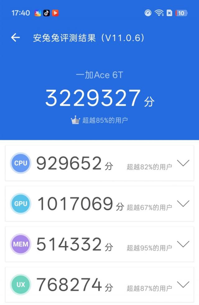 安兔兔跑分中,一加 Ace 6T 获得322万分,其中第五代骁龙8的CPU+GPU分数达194万分,性能超越骁龙8至尊版。