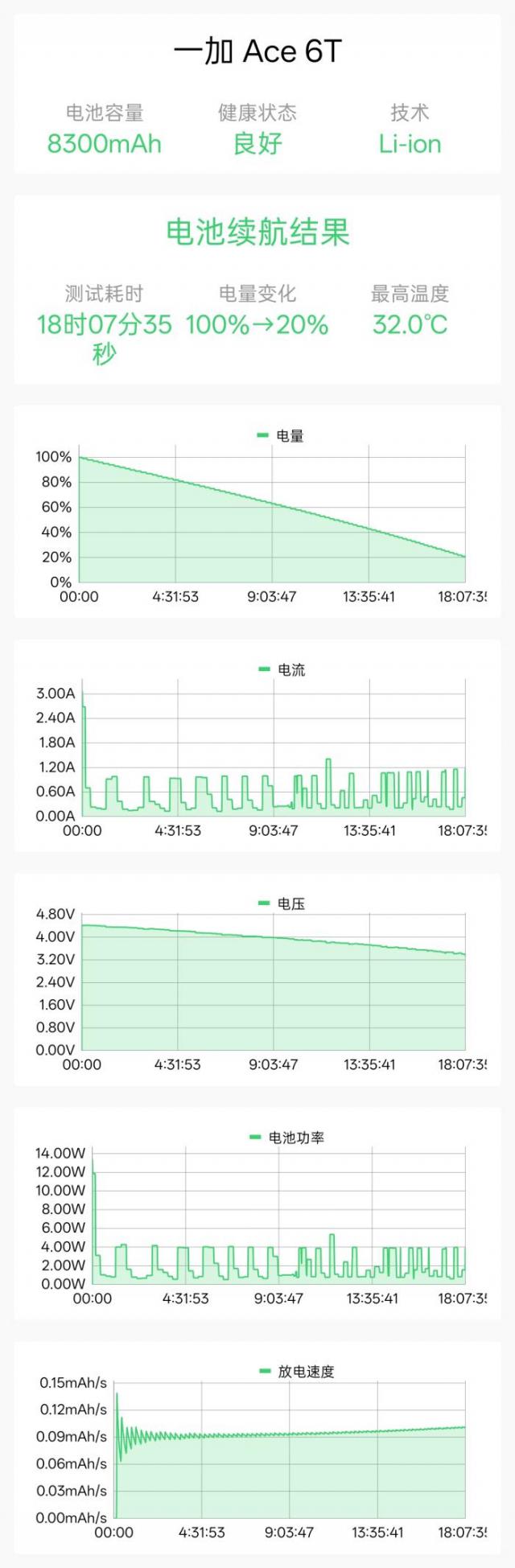 测试结果显示,一加 Ace 6T 从100%到20%电量的续航时间达18小时07分钟,满电状态轻松超过20小时。