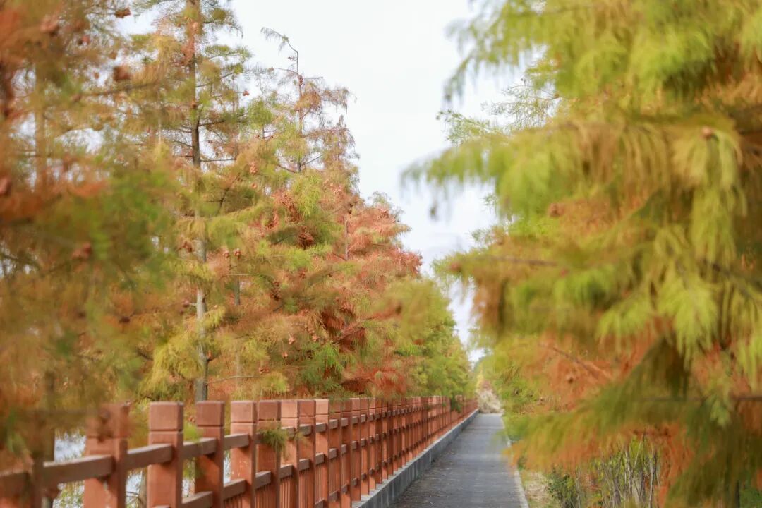 紫石泾河道旁的水杉,褪去春夏的青绿色外衣,换上一身日渐浓郁的锈红色,笔直地排列在河岸,将身影映入潺潺流水。天空、树影与水光在此交织,沉静而庄重,仿佛一条通往季节深处的长廊。