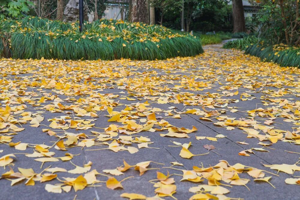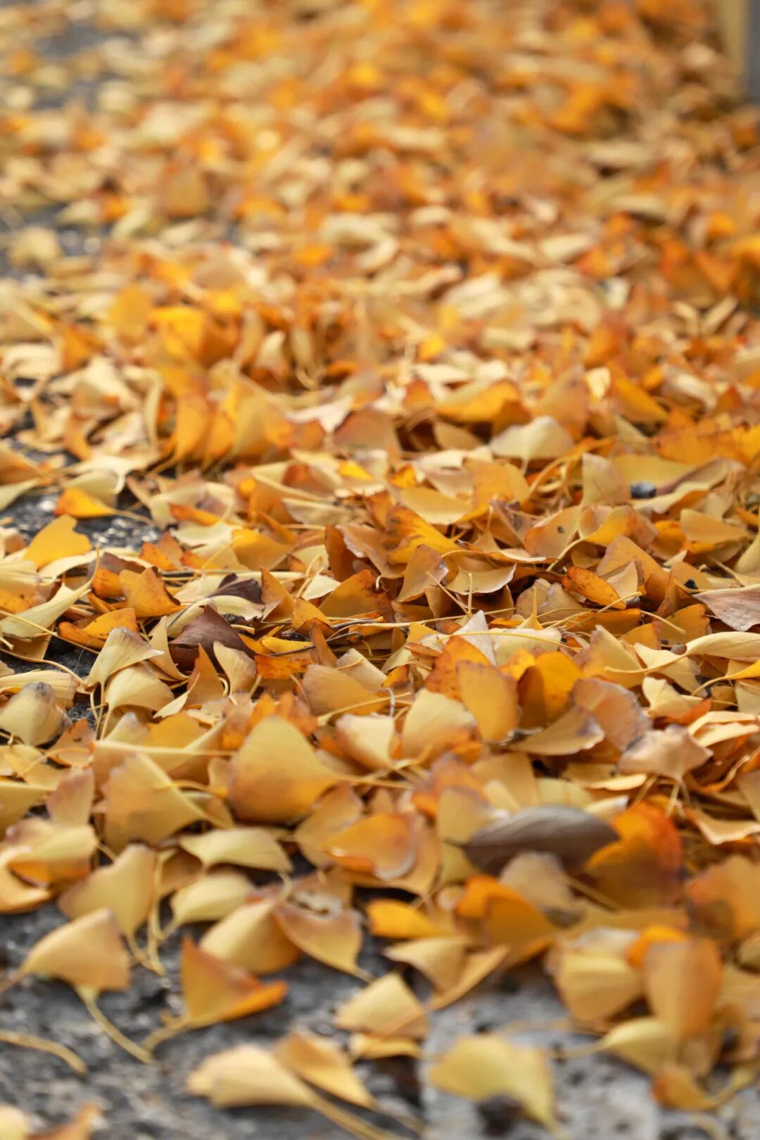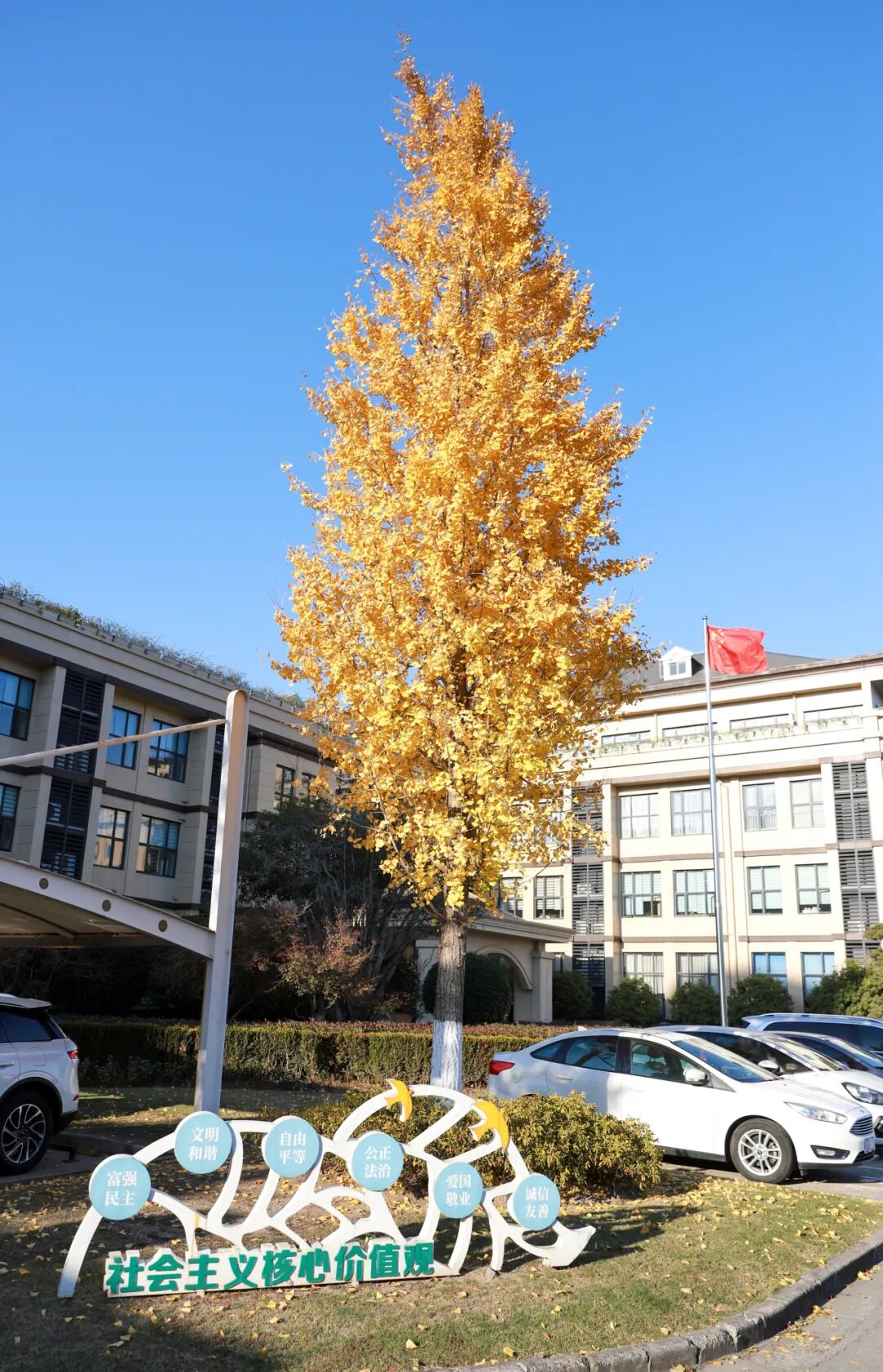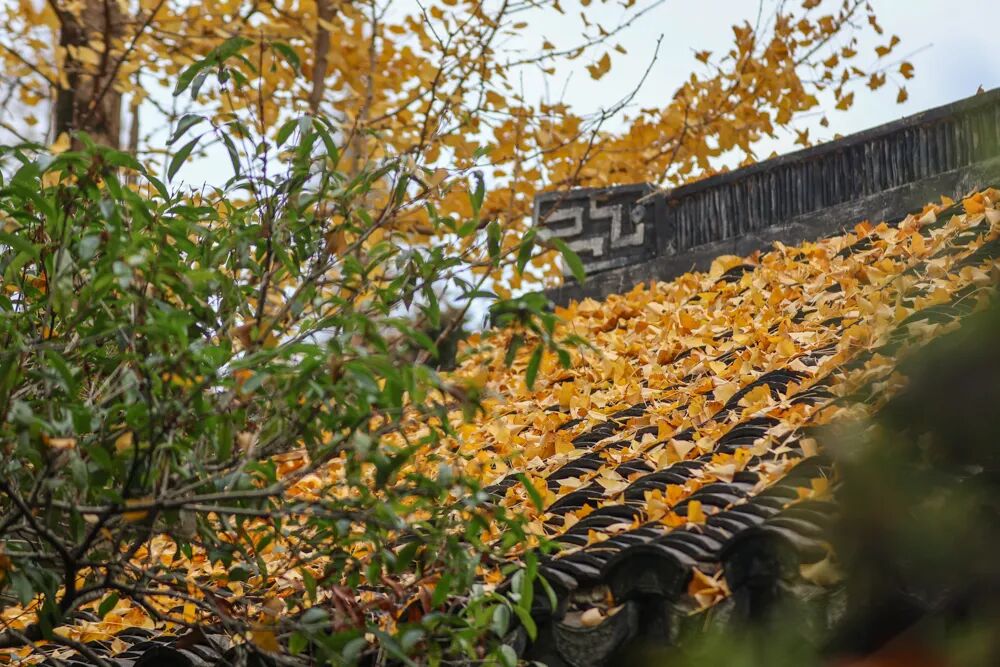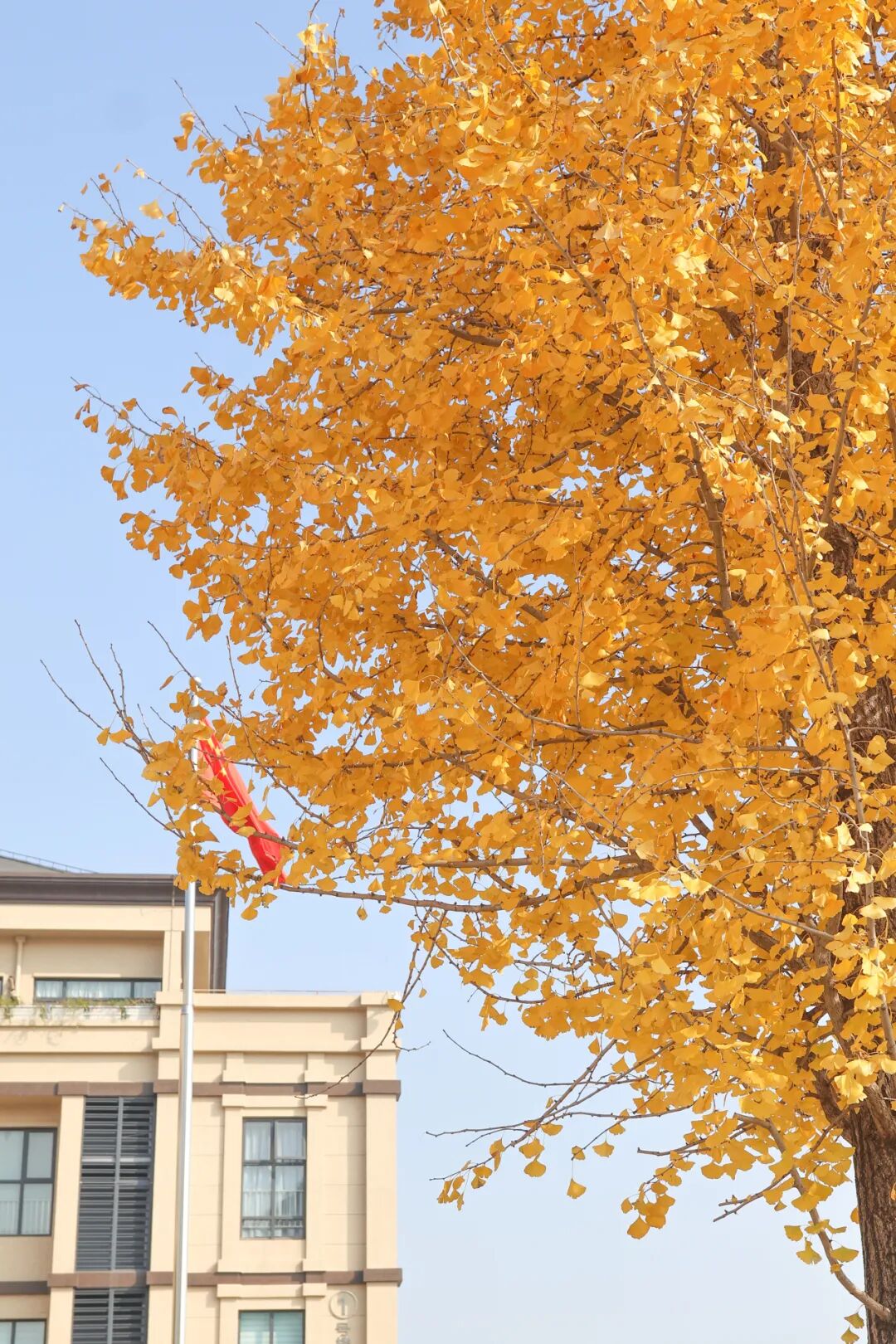 秋意深谙对称之美——张堰镇政府院内的银杏与社区学校里的古银杏,像是约好了一般,一同将夏日留存的绿意换成金箔。风起时,小小的扇形叶片簌簌飘落,在地面铺就一片能沙沙作响的时光。