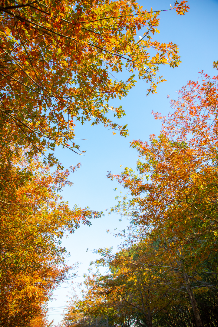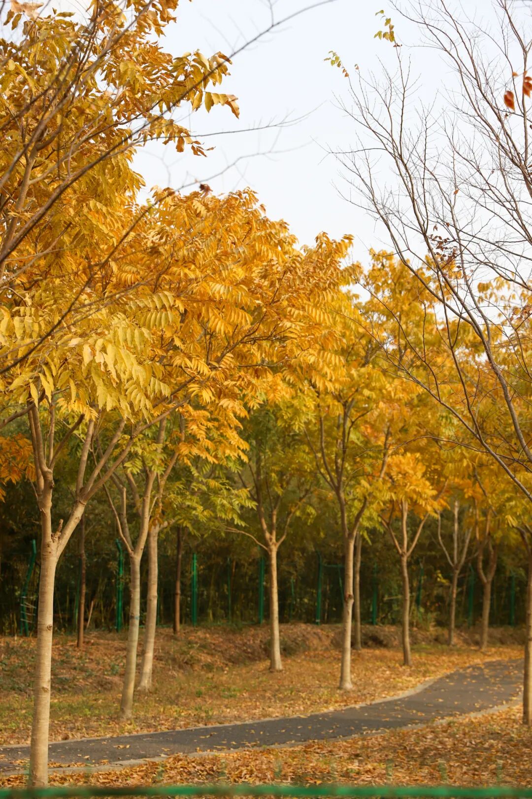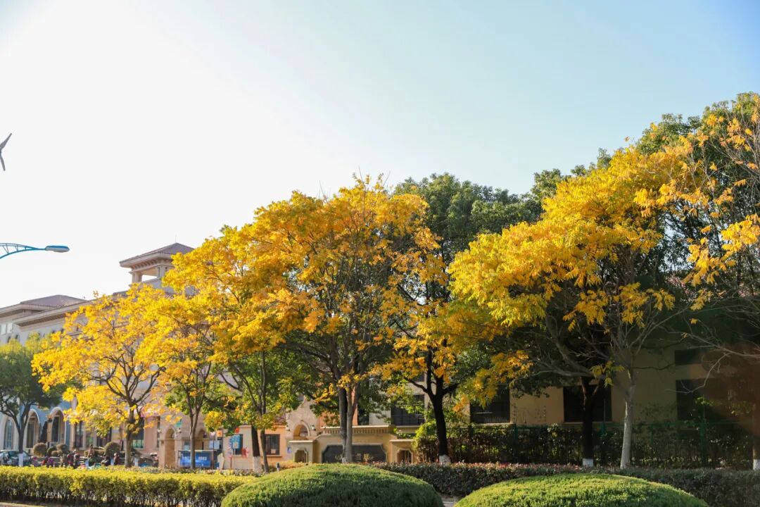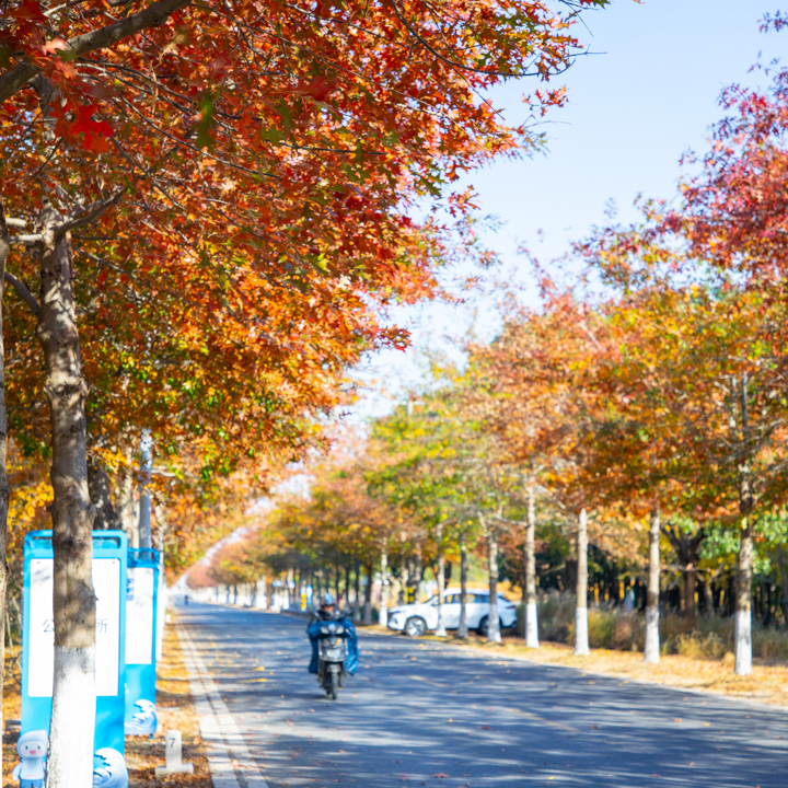 光线从枝叶缝隙间洒落,在干净的路面上投下摇曳的光斑。走在路上,脚下踩着明暗交错的影子,心里却似被这满眼的暖色调烘得格外柔和。