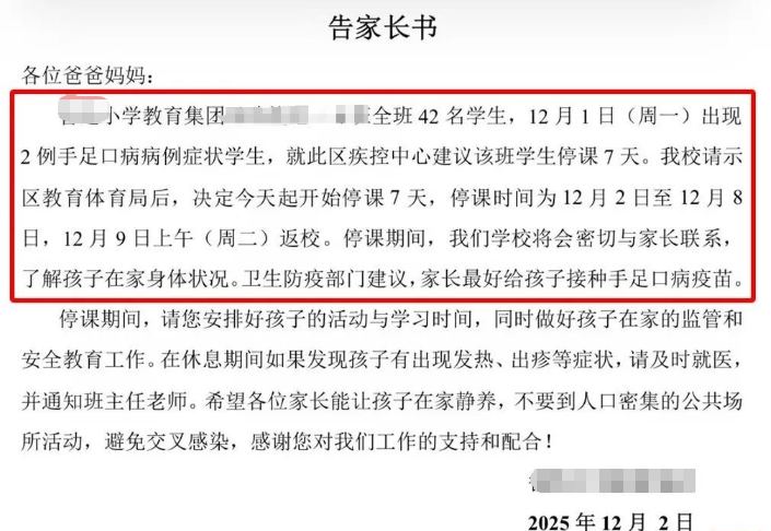 当前气温持续下降,流感高发的同时,手足口病也悄然来袭。浙江绍兴某小学就因班级内出现2例手足口病症状学生,决定从12月2日至12月8日停课7天,12月9日上午学生返校复课。